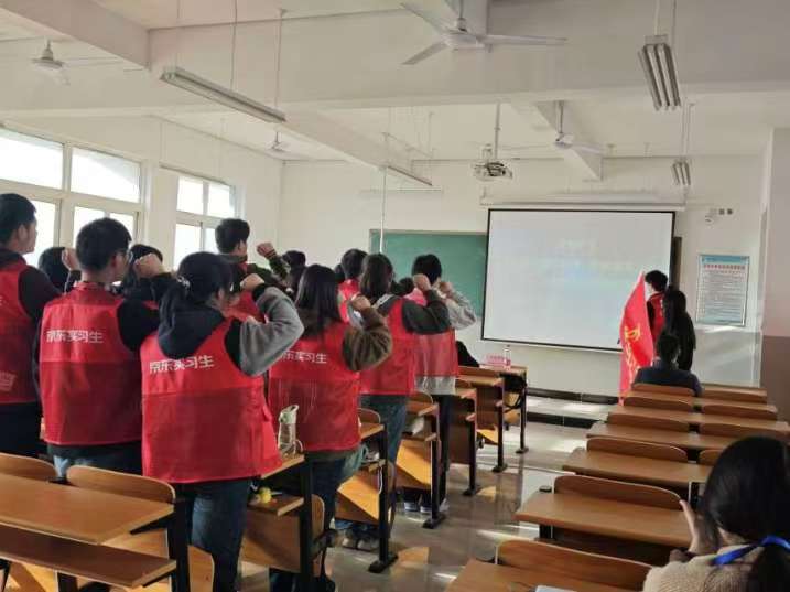 培训于10月22日晚正式启动,通过动员大会、分组选干等形式,明确培训的目标与纪律,增强学生的归属感与责任感。10月23日上午,开训仪式在诚意楼A301教室隆重举行。仪式由管理学院院长刘冬华主持,校企双方代表共同出席,包括安徽京东物流用人保障部负责人宋鹏、网招部经理熊佩军,以及管理学院党总支书记阮进兵、物流管理系主任杨秀莲、人力资源系教师吴霁君等。仪式上,院企领导分别致辞,勉励学生把握实习机会、提升综合能力,并举行了庄严的授旗仪式与集体宣誓,进一步坚定了学生的职业信念与团队认同。