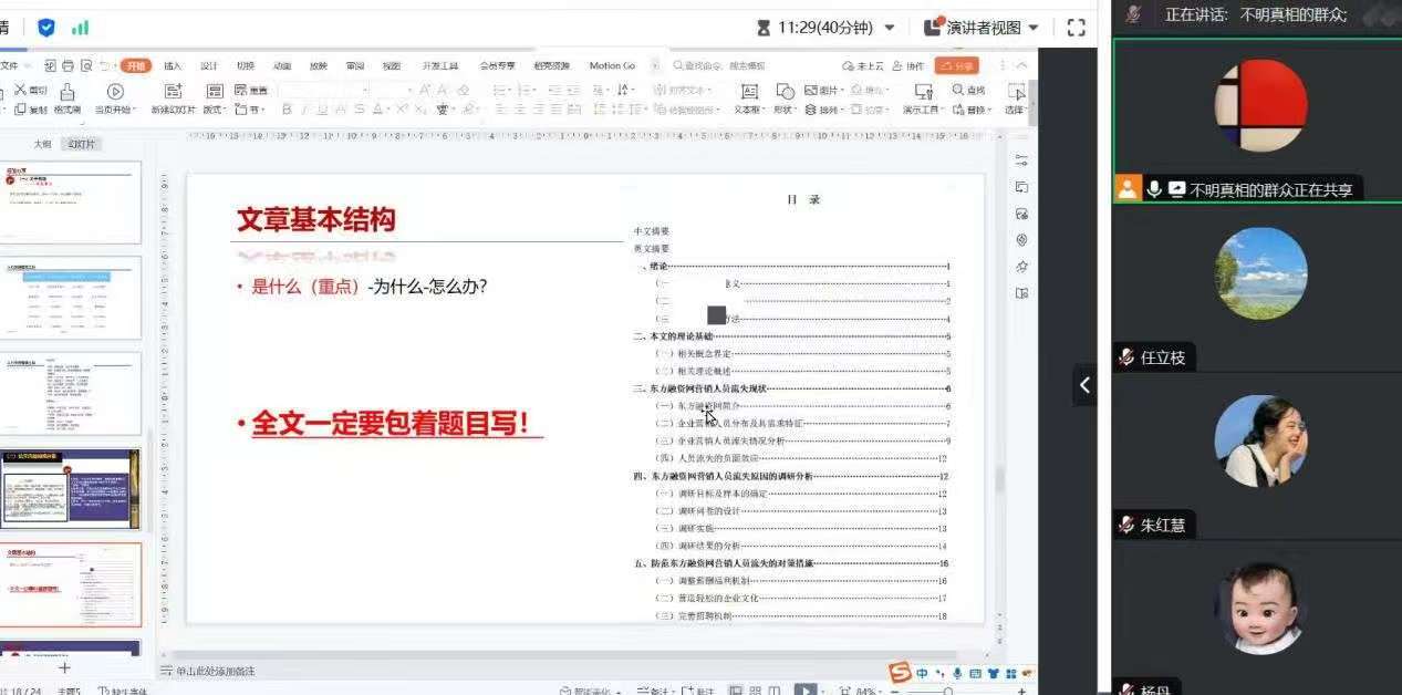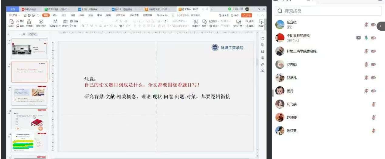 随后,房君老师从论文的整体结构入手,逐步深入到研究内容、选题价值、研究方法等核心部分,并结合实际案例进行剖析,并强调,论文选题应紧密结合人力资源管理专业领域的前沿动态与社会实践需求,注重理论与实践的结合,突出专业特色与应用价值。