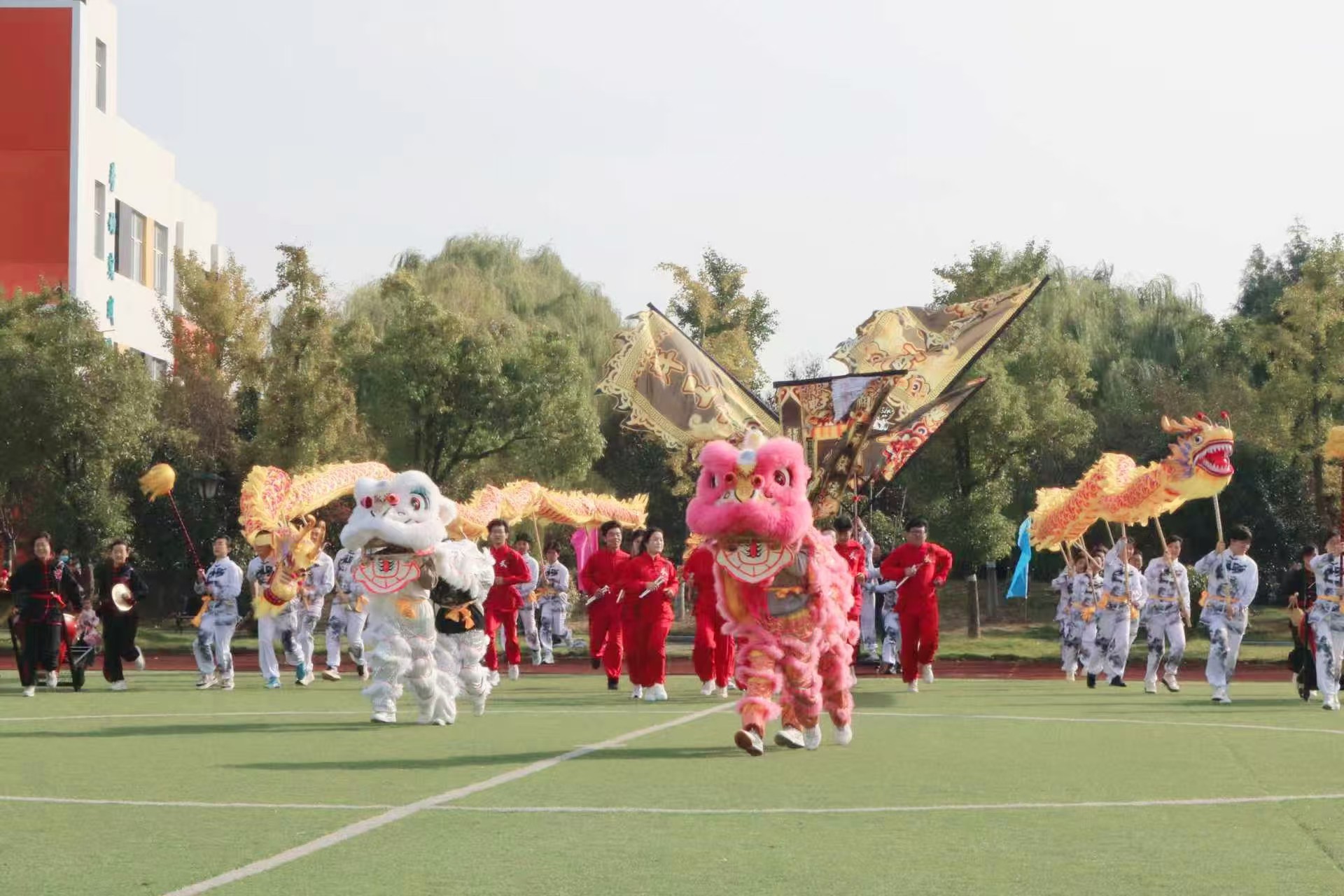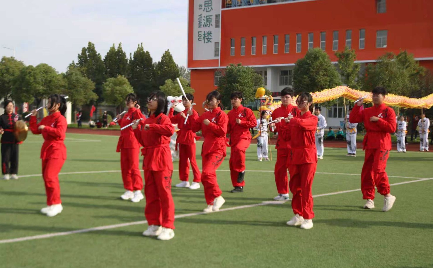 活动现场,激昂的鼓点骤然响起,瞬间点燃全场氛围。两只色彩鲜亮的舞狮率先登场,灵动的跳跃、憨态可掬的造型引得现场掌声不断;紧接着,金色双龙翻腾而出,时而盘旋舞动,时而昂首摆尾,精湛的表演牢牢吸引了全场目光,特教中心的孩子们纷纷瞪大双眼,脸上洋溢着惊喜的笑容。随后,学院双截棍协会成员身着统一服装,带来刚劲有力的传统棍术表演,利落的动作、整齐的节奏,让孩子们忍不住拍手欢呼,现场洋溢着欢乐温馨的氛围。