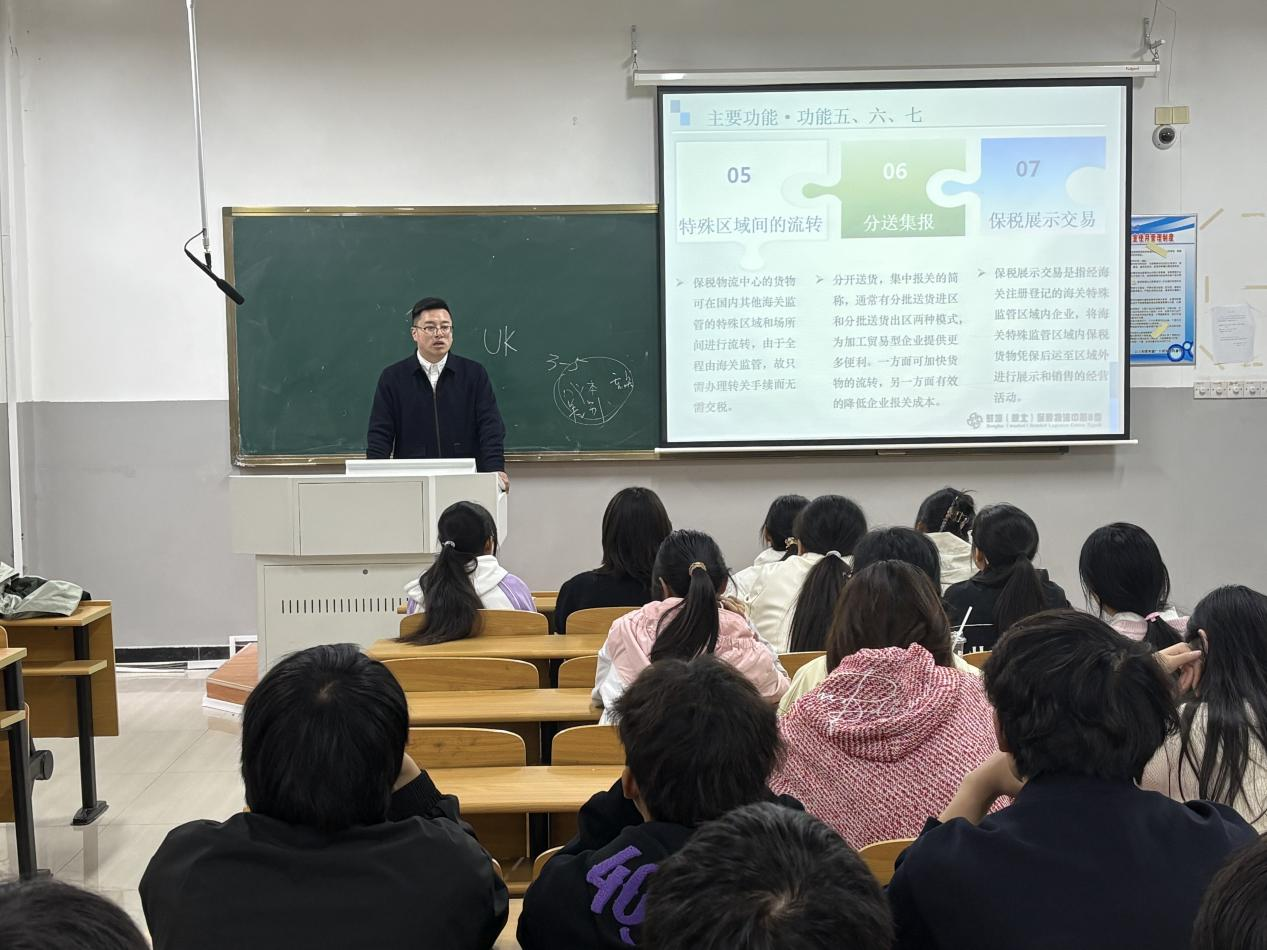 此次讲座不仅让在场的师生对蚌埠综合保税区有了更深入的了解,也激发了大家对参与区域经济建设思考的热情。未来,学院将持续推进“企业家进课堂”系列活动,深化产教融合,为学生们搭建更多了解行业动态、提升专业技能的平台。(图文/物流管理系 审核/杨秀莲)