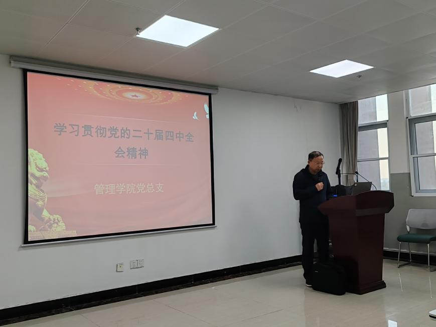 为深刻领会和全面把握党的二十届四中全会精神,11月6日下午,管理学院召开全体教职工大会,专题学习党的二十届四中全会精神。学院党总支书记阮进兵主持会议,并领学了习近平总书记重要讲话精神和《中共中央关于制定国民经济和社会发展第十五个五年规划的建议》、全会《公报》,同时对下一步深入学习贯彻提出了明确要求。
