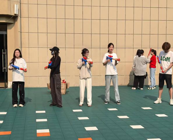 活动的第二站转移到社区对面的幼儿园操场。活动组织者将所有大学生分为两对,开展玩具枪趣味对战游戏。大家手持彩色玩具枪,在奔跑、躲避和“射击”中尽情释放压力,现场欢呼声与呐喊声此起彼伏。这个游戏不仅让同学们在紧张的学习生活中得到了放松,还培养了大家的团队协作精神和竞争意识。