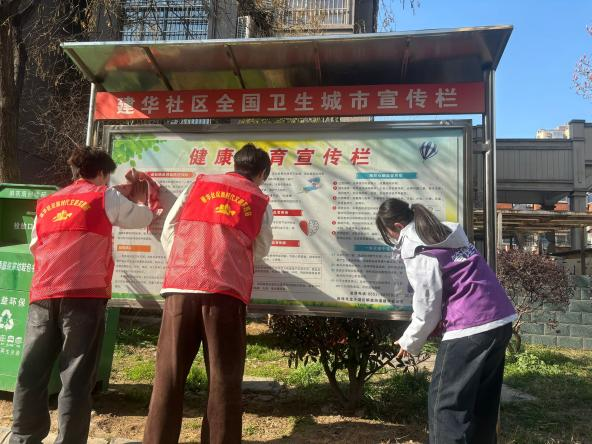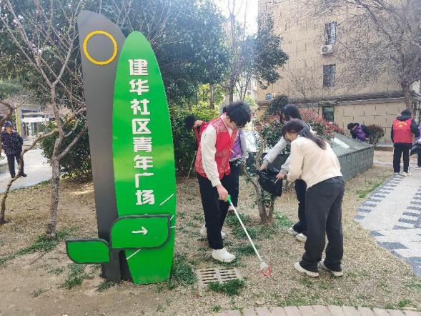 活动当天,志愿者们身着红色马甲,手持垃圾钳和环保袋,分组对建华社区主干道、绿化带、公共活动区域展开全面清理。他们弯腰捡拾散落的烟头、纸屑、塑料袋等垃圾,利用铲刀、抹布等工具,对社区单元楼道内的小广告进行彻底清除,细致擦拭社区宣传栏等,尽管任务琐碎,但同学们热情高涨,分工协作,经过大家的共同努力,社区环境焕然一新。