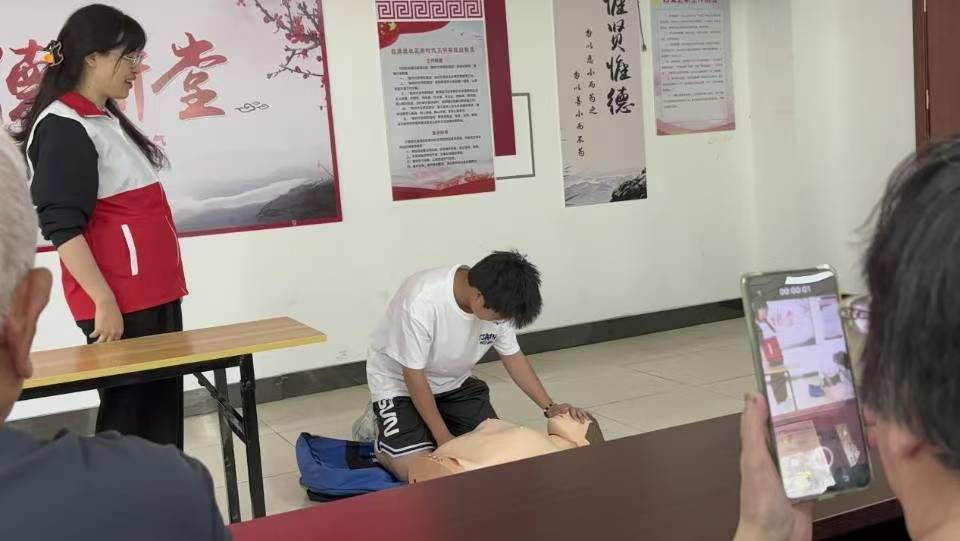 讲解员说:“当身边有人突然倒地,前四分钟是挽救生命的黄金时间。”而掌握正确的急救方法,在四分钟内对患者进行急救,便可以大大提高患者的存活率,讲解员先是为大家亲自演示了一遍如何正确对患者进行急救,先检查患者的脖颈处是否有损伤,再轻拍患者双肩并在左右耳呼唤患者,若无意识则检查是否存在脉搏和呼吸,之后再对患者进行正确心脏按压,每三十次为一组,一组过后清理患者呼吸道并进行两次人工呼吸,再继续进行心脏按压,持续五组心肺复苏后观察患者意识。讲解员演示之后,还邀请了志愿者们和老人们也上台体验对假人进行急救并指导。