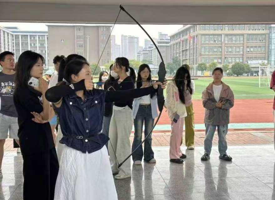 射五毒靶面绘着蜈蚣、毒蛇、蝎子、壁虎与蟾蜍五种毒物,每个“毒物”标注着不同分值。裁判刚宣布完规则,参赛同学们便迅速围拢,摩挲着手中的弓箭跃跃欲试。随着比赛进入白热化,操场上的箭矢穿梭如流星。每当有人射中分值区域,场边便喝彩声不断,将端午驱邪祈福的氛围渲染得淋漓尽致。