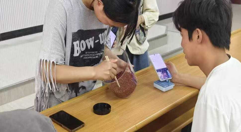 盛满赤豆的塑桶是起点,空置的量杯则是“终点”。随着裁判按下秒表,此起彼伏的“沙沙”声骤然响起,参赛学生们个个屏气凝神,使用筷子夹取红豆。现场气氛紧张热烈,筷子在指尖灵活翻动,一颗颗红豆被迅速夹起,展现出同学们的手眼协调能力。有人稳扎稳打,精准卡住红豆;有人追求速度,红豆崩落便立刻调整角度。大家都在为争取在1分钟内夹取更多红豆而努力。